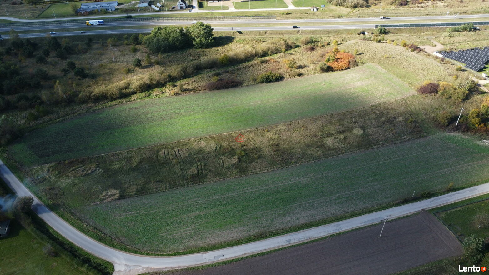 Nieruchomość gruntowa o powierzchni 4350 m w kształcie trapezu (szerszą podstawą od drogi, ok. 42x142x33x118 metrów).